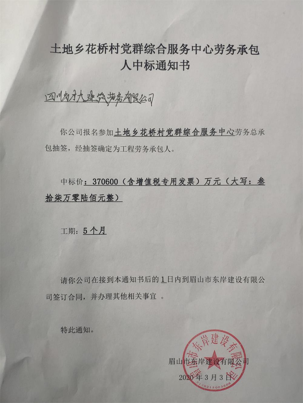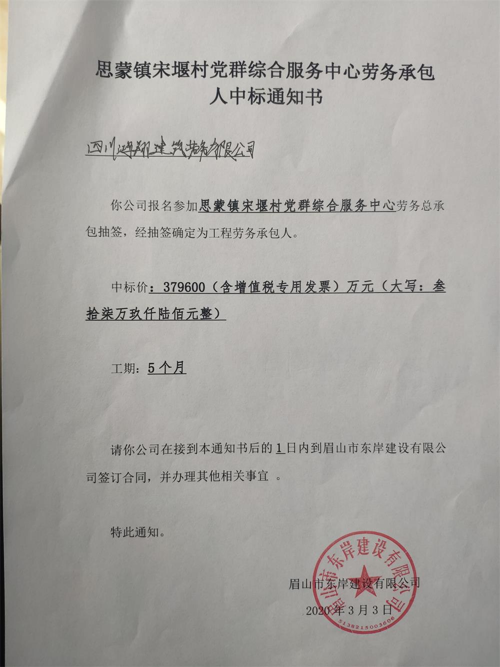 關(guān)于思蒙鎮(zhèn)宋堰村黨群綜合服務(wù)中心和土地鄉(xiāng)花橋村黨群綜合服務(wù)中心中標通知