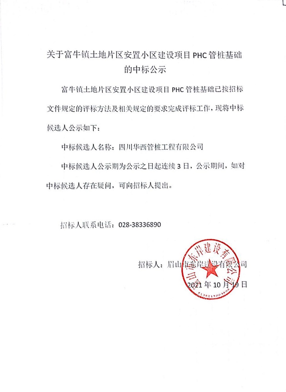 富牛鎮(zhèn)土地片區(qū)安置小區(qū)建設(shè)項目PHC管樁基礎(chǔ)項目中標公示