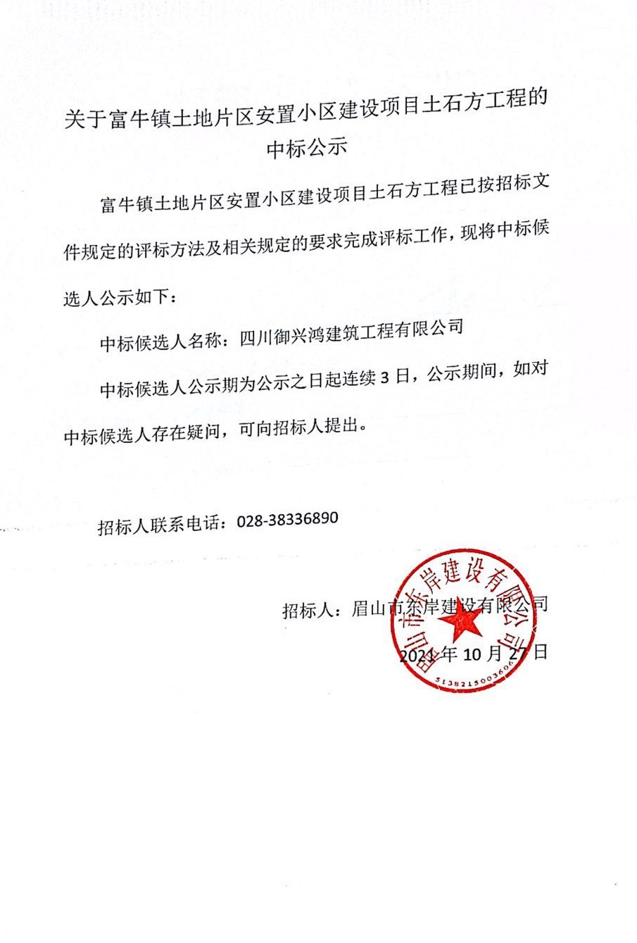 關(guān)于富牛鎮(zhèn)土地片區(qū)安置小區(qū)建設(shè)項目土石方工程的中標(biāo)公示