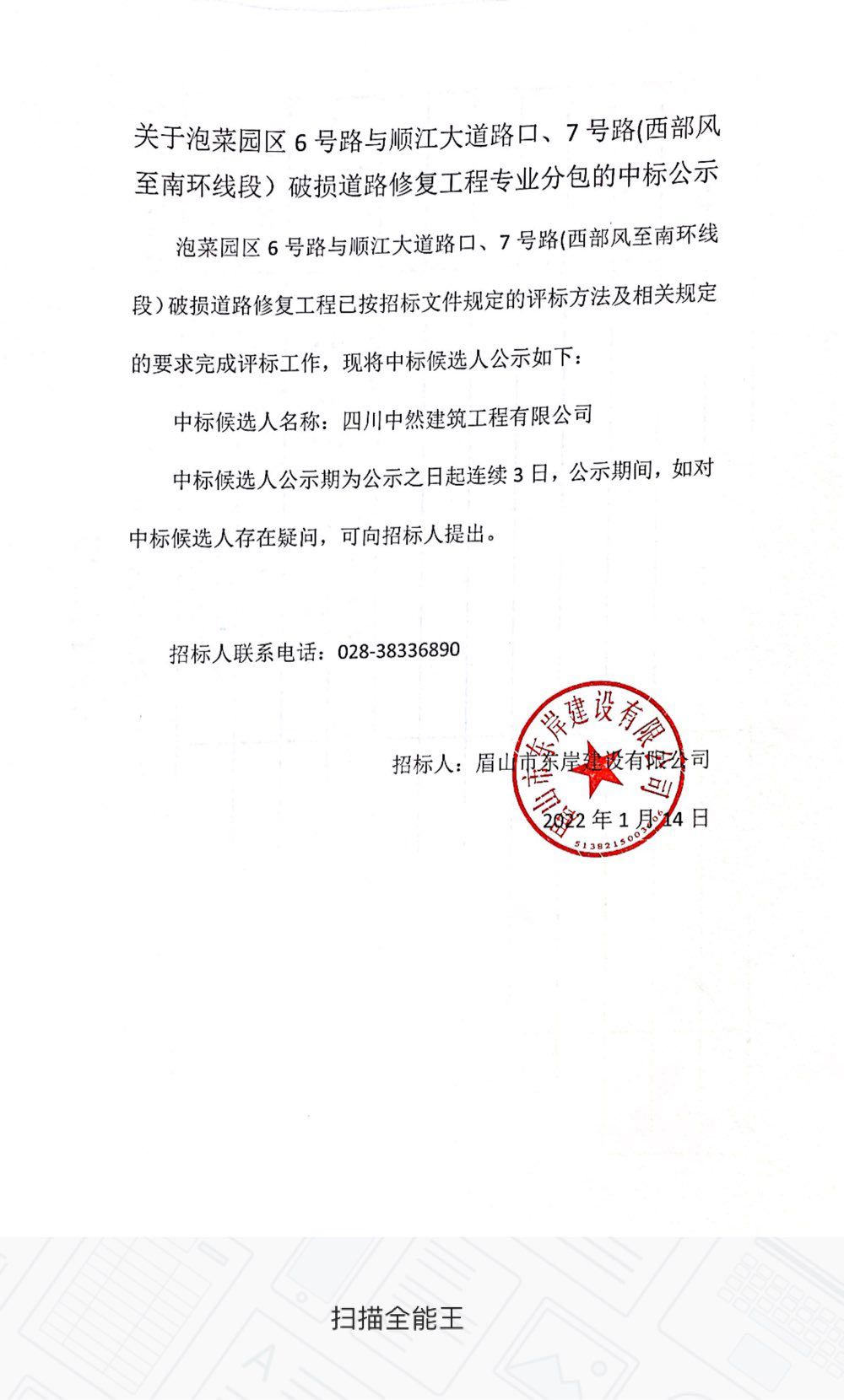 關(guān)于泡菜園區(qū)6號(hào)路與順江大道路口、7號(hào)路(西部風(fēng)至南環(huán)線段)破損道路修復(fù)工程專業(yè)分包的中標(biāo)公示